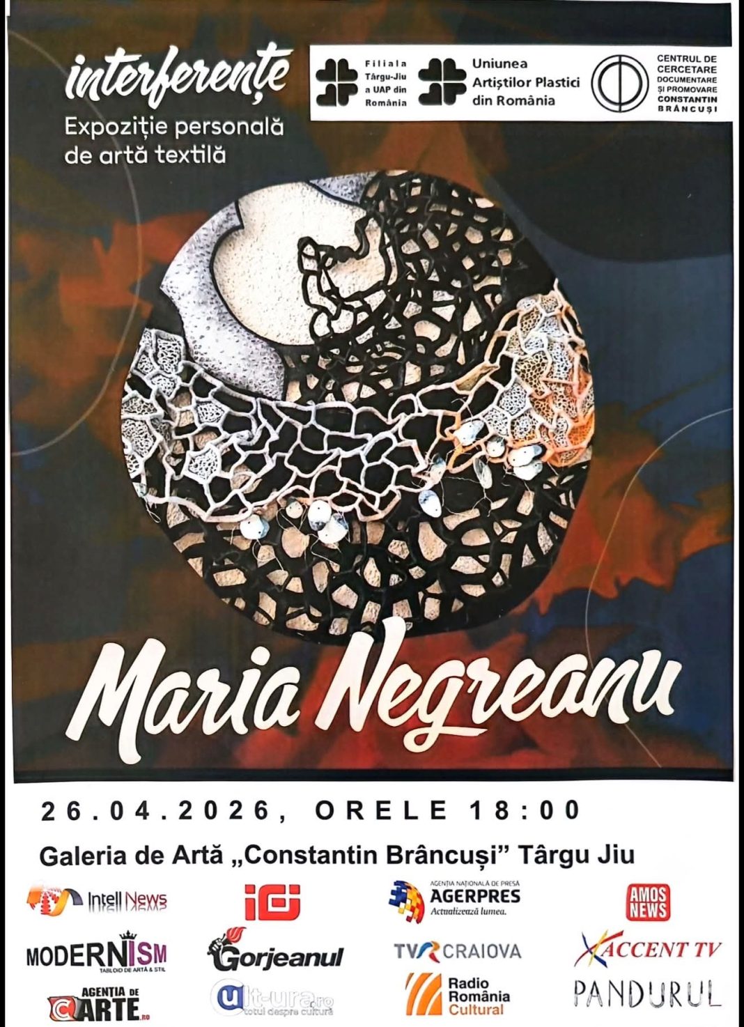 Uniunea Artiștilor Plastici din România – Filiala Târgu Jiu anunță deschiderea expoziției personale de artă textilă semnată de artista Maria Negreanu, un eveniment dedicat expresiei contemporane în arta textilă și sensibilității estetice a creației actuale.