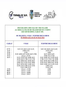 Societatea Transloc S.A. anunță introducerea unui program special de transport public în perioada 1, 2 și 3 mai 2026, pentru a facilita deplasarea cetățenilor pe traseul 9 Mai – Pădure Drăgoieni.